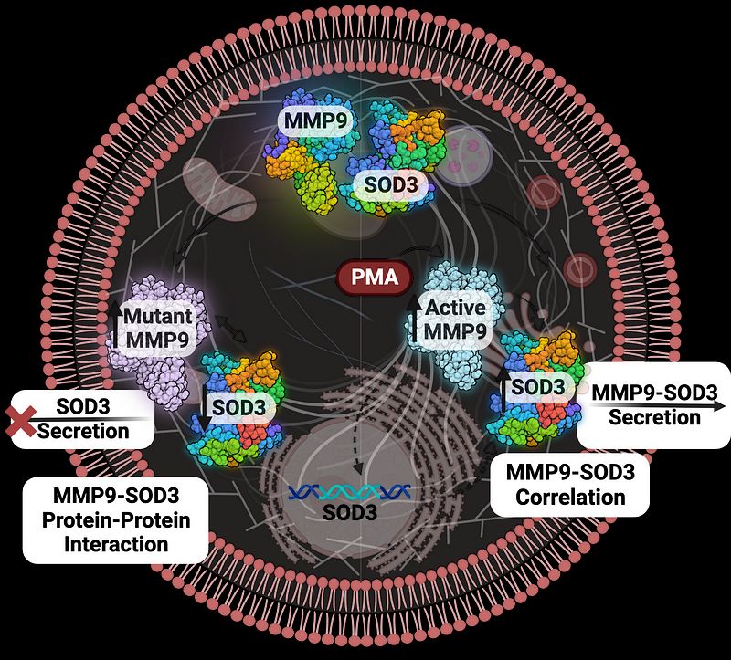Deciphering MMP9's Dual Role in Regulating SOD3 through Protein-Protein Interaction.